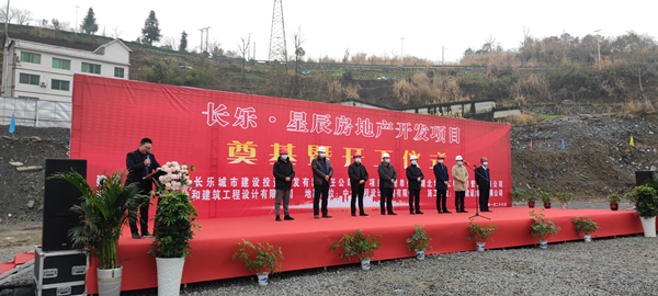 2021年1月26日上午,由开云官方在线入口承建的长乐▪星辰住宅项目奠基暨开工仪式在项目现场热烈举行。湖北省宜昌市五峰土家族自治县住房和城乡建设局副局长陈白华、县质量安全监督站站长邓简涛、开云官方在线入口五峰长乐▪星辰项目经理王国云,项目参建各方及新闻媒体共40余人出席。宜昌市长乐城市建设投资开发有限责任公司总经理刘鹏主持。